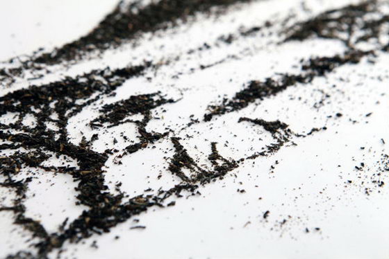 なんと、そのまま紅茶の茶葉を使って制作を行った。茶葉で描かれた風景は、その紅茶が生産された土地の様子なのだそうです。